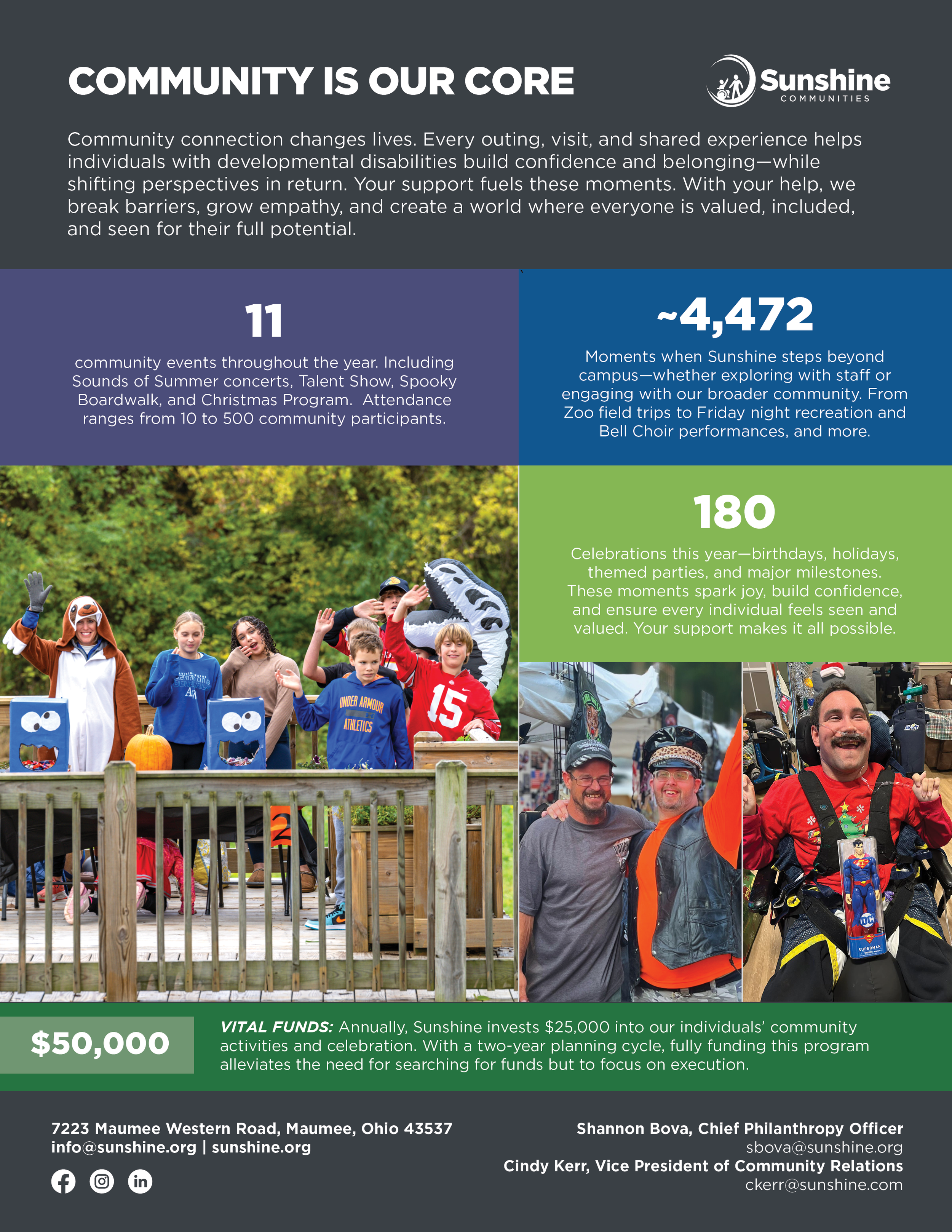Sunshine Communities is a non-profit serving individuals with physical, intellectual, and cognitive disabilities. As the Graphic Design and Communications Coordinator, I support the Community Relations teams with design solutions across diverse platforms and mediums, spanning all departments and retail entities. Sunshine Communities celebrated 75 years in 2024 and I helped to guide the non-profit’s rebrand and develop visual identities for a number of signature events put on in the community.
